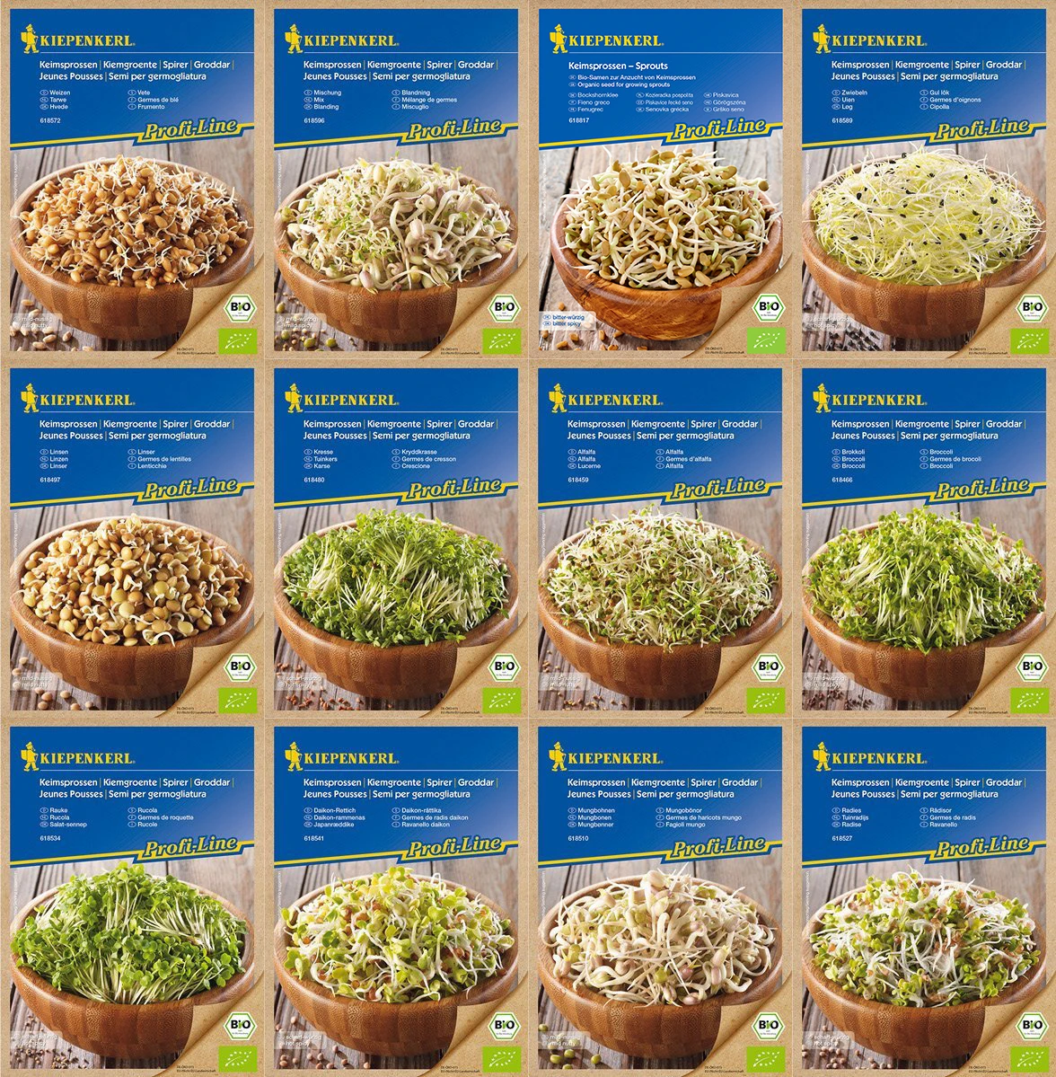 Dieses Sortiment enthält 12 verschiedene Bio-Keimsprossen-Sorten von Kiepenkerl. Folgende Sorten sind enthalten: