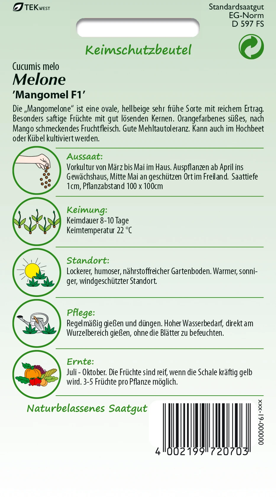 De „Mangomelone“ ist eine ovale, hellbeige sehr frühe Sorte mit reichem Ertrag. Besonders saftige Früchte mit gut lösenden Kernen. Orangefarbenes süßes, nach Mango schmeckendes Fruchtfleisch. Gute Mehltautoleranz. Kann auch im Hochbeet oder Kübel kultiviert werden.