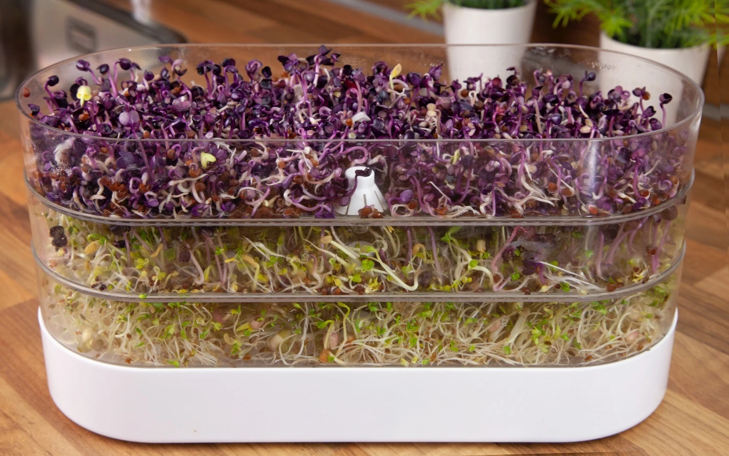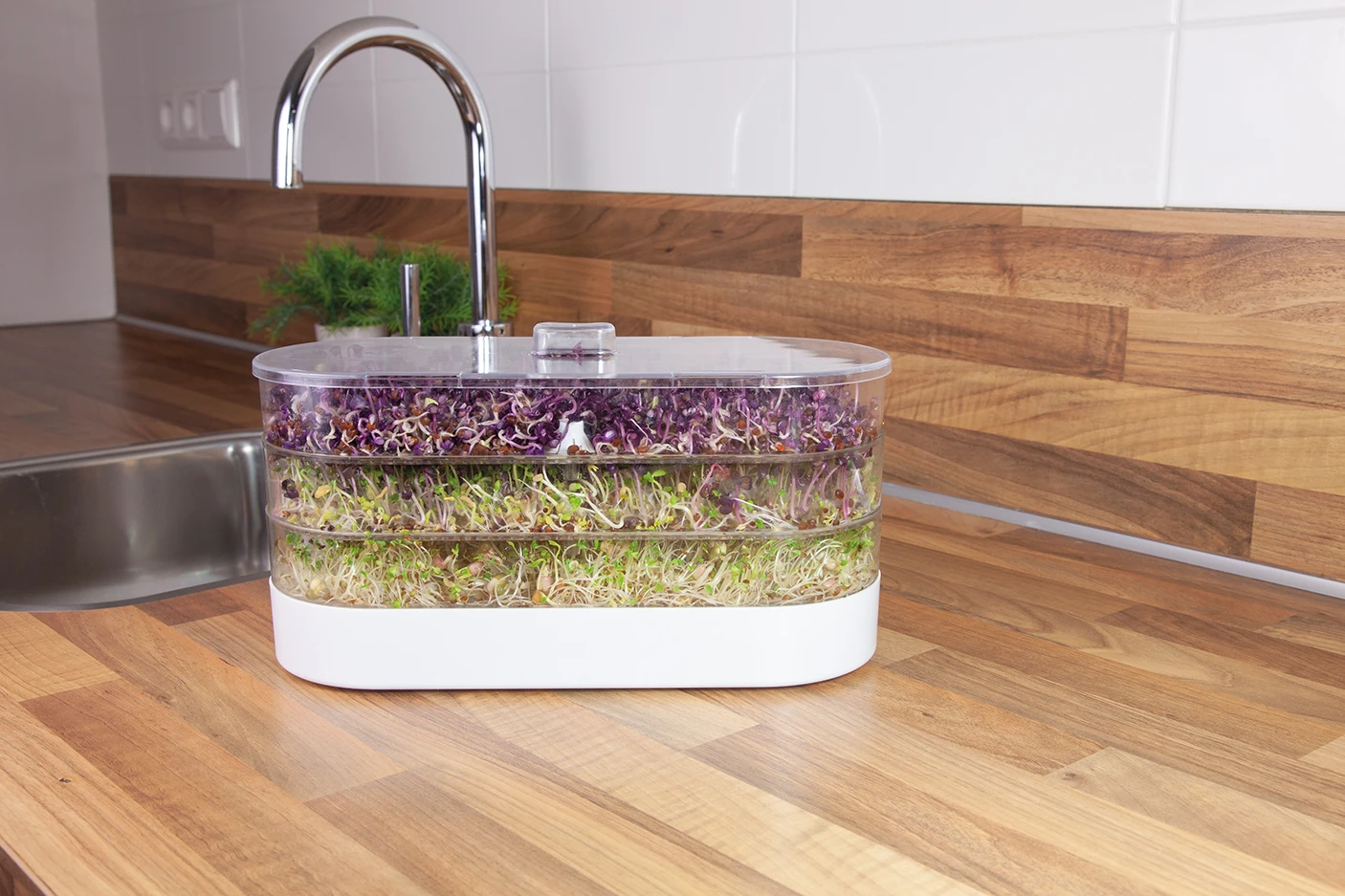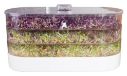 Sie lieben Sprossen? Dann liegen Sie mit dem Sprossenturm richtig. Auf drei Etagen können Sie verschiedene Sprossen anziehen. Mit den kleinen Vitaminbomben können Sie gerade im Winter Ihre Ernährung gut aufpeppen.